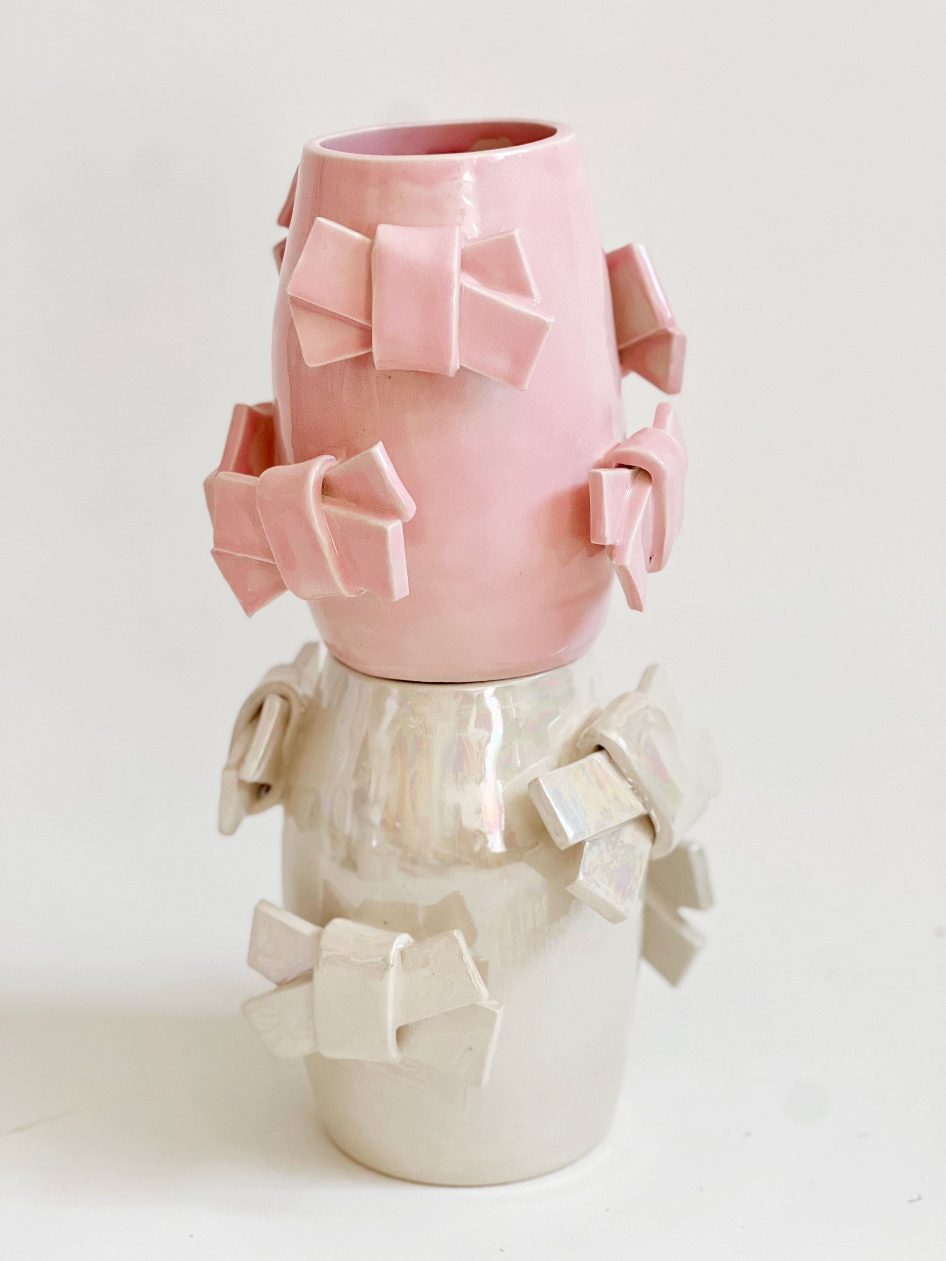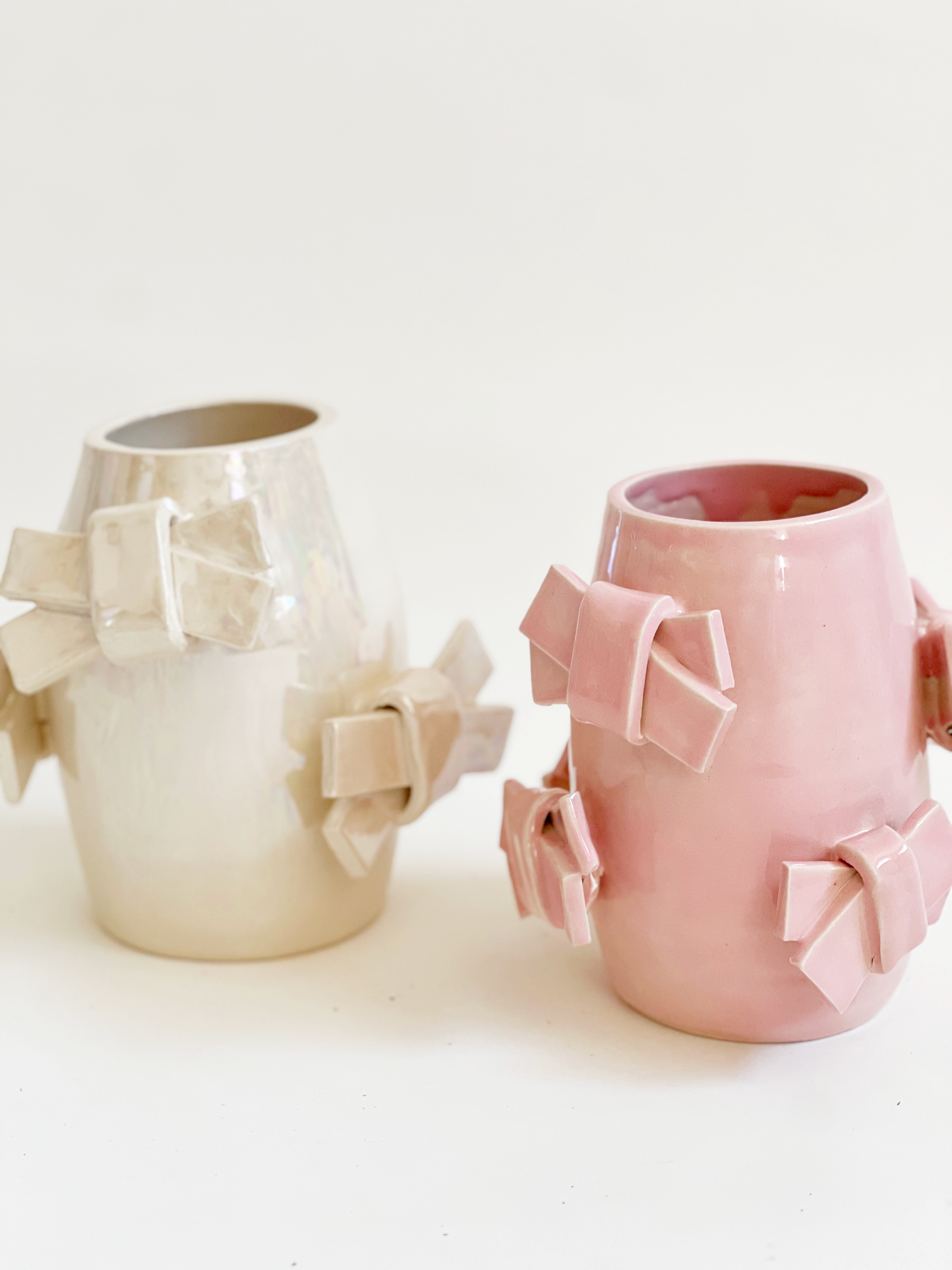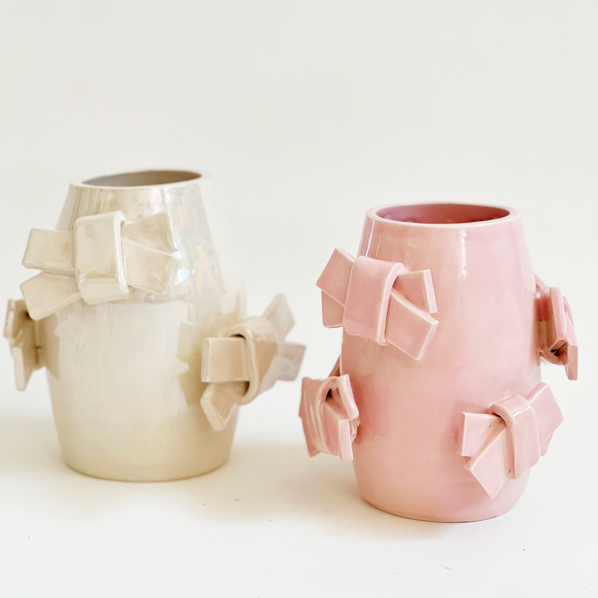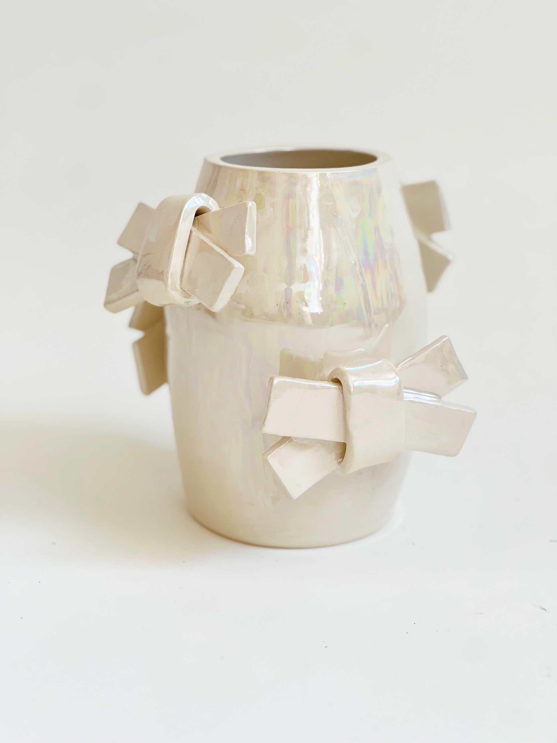 A bow, paused in porcelain. Folds captured mid-gesture, soft yet structured, wrapping around the vase like a ribbon made solid. Both playful and composed, it holds space for flowers—or simply for itself, as a quiet sculpture in the room.